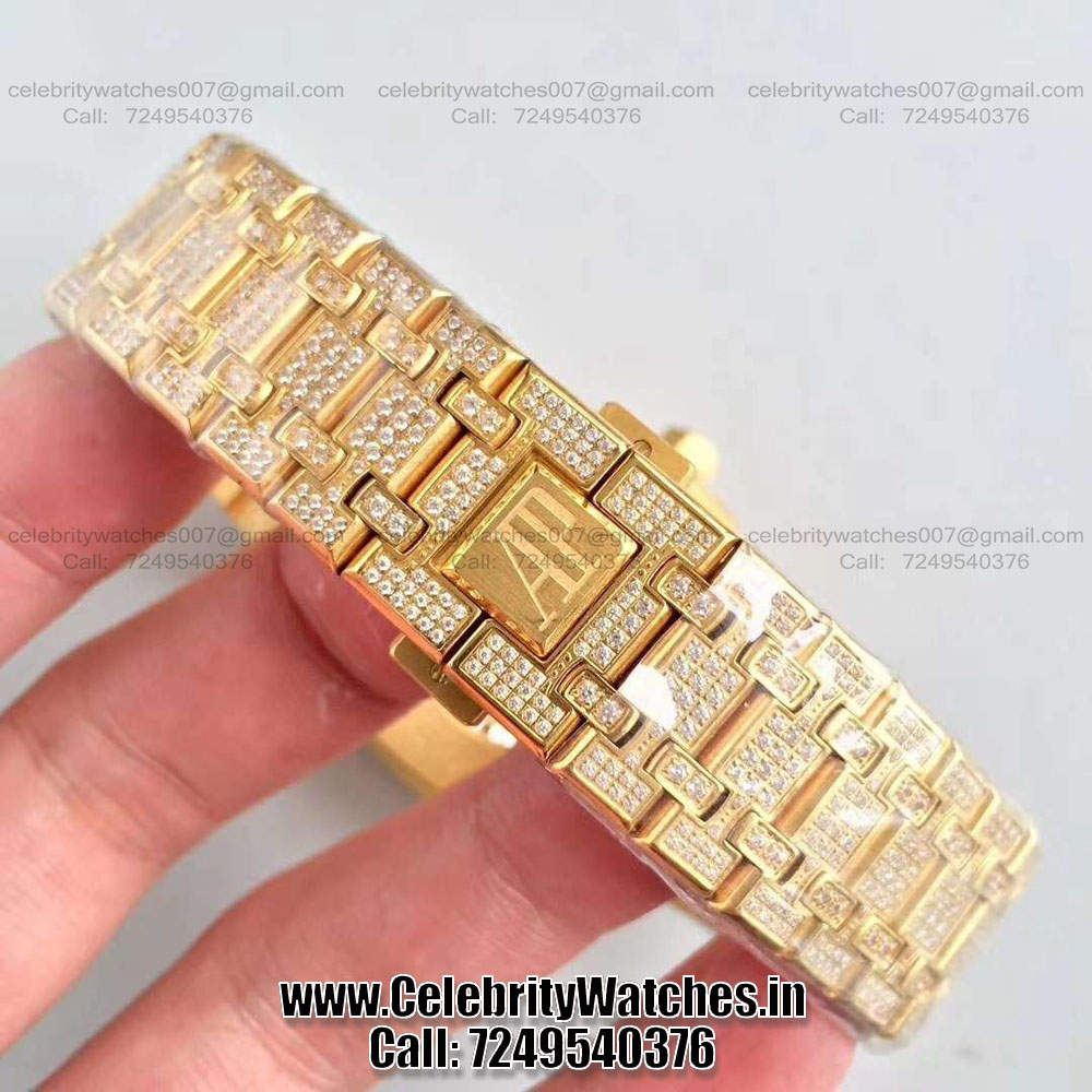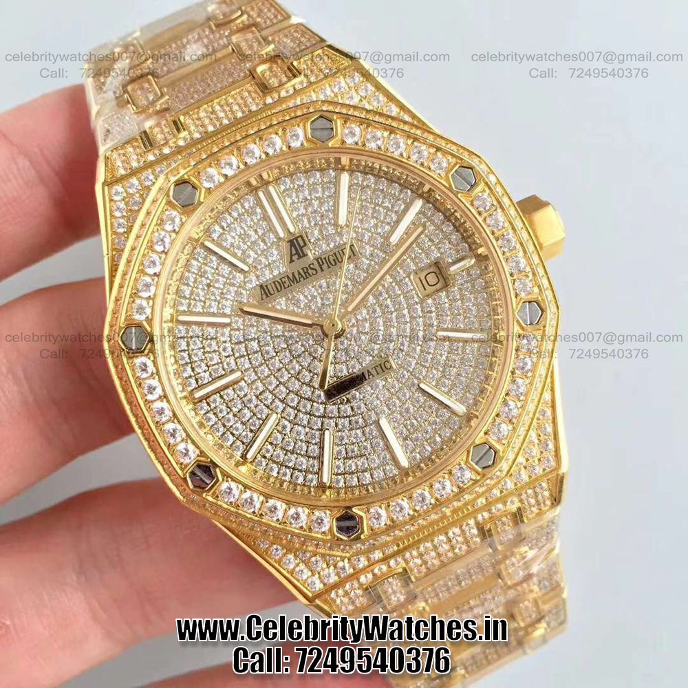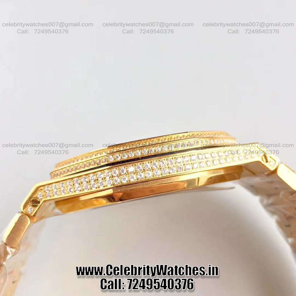 | CASE | – Size: 41mm. 5 layer 18K Gold Plated case, fully Diamond Studded – Thickness: 10.8mm, Screw Locked Crown – Transparent Sapphire Crystal Case-back to see inner machine – Dimensions and Weight 100% identical with genuine. |