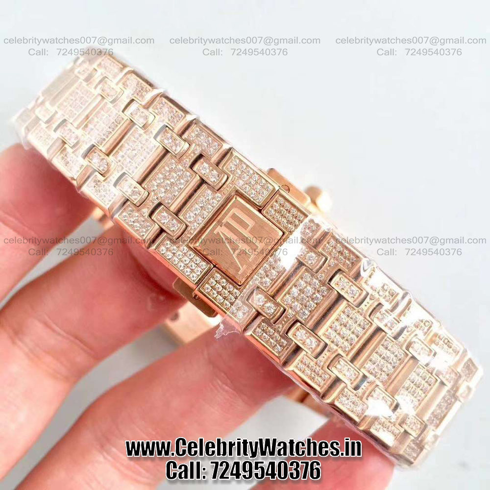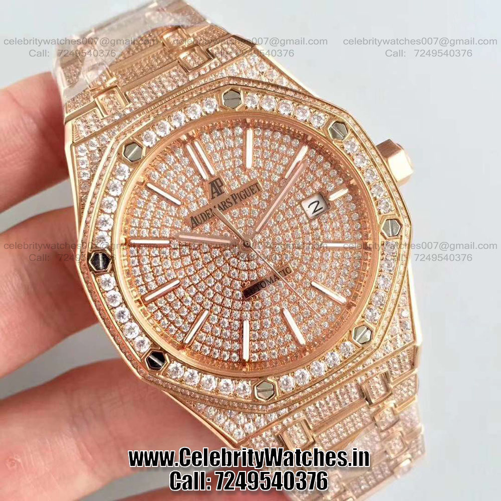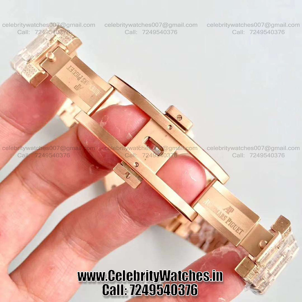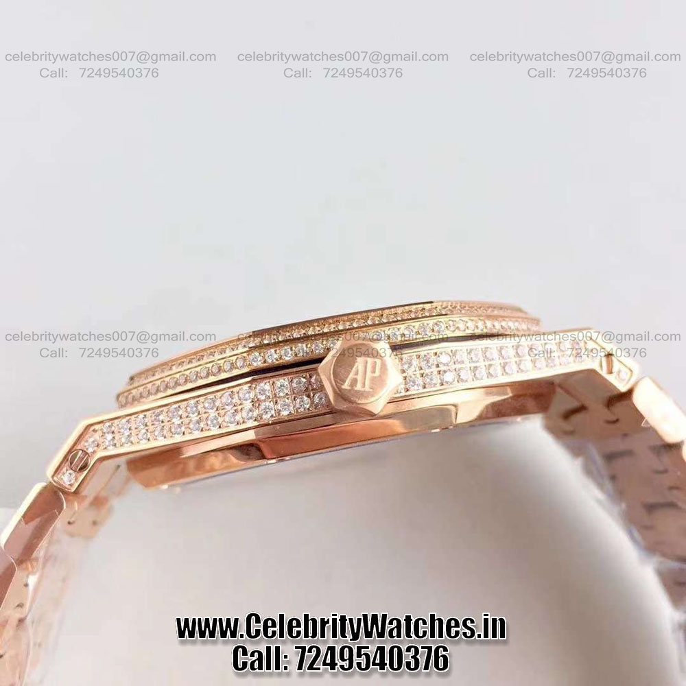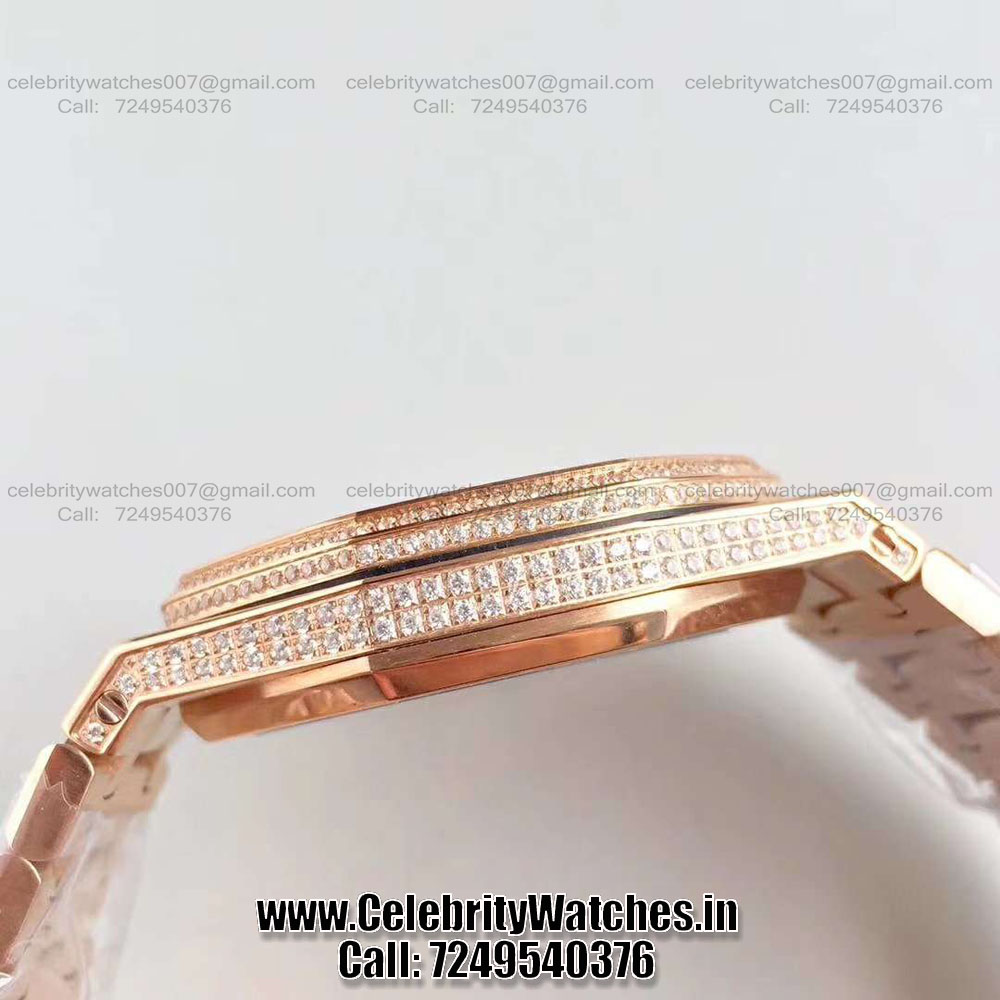 | CASE | – Size: 41mm. 5 layer 18K Rose Gold Plated case, fully Diamond Studded – Thickness: 10.8mm, Screw Locked Crown – Transparent Sapphire Crystal Case-back to see inner machine – Dimensions and Weight 100% identical with genuine. |