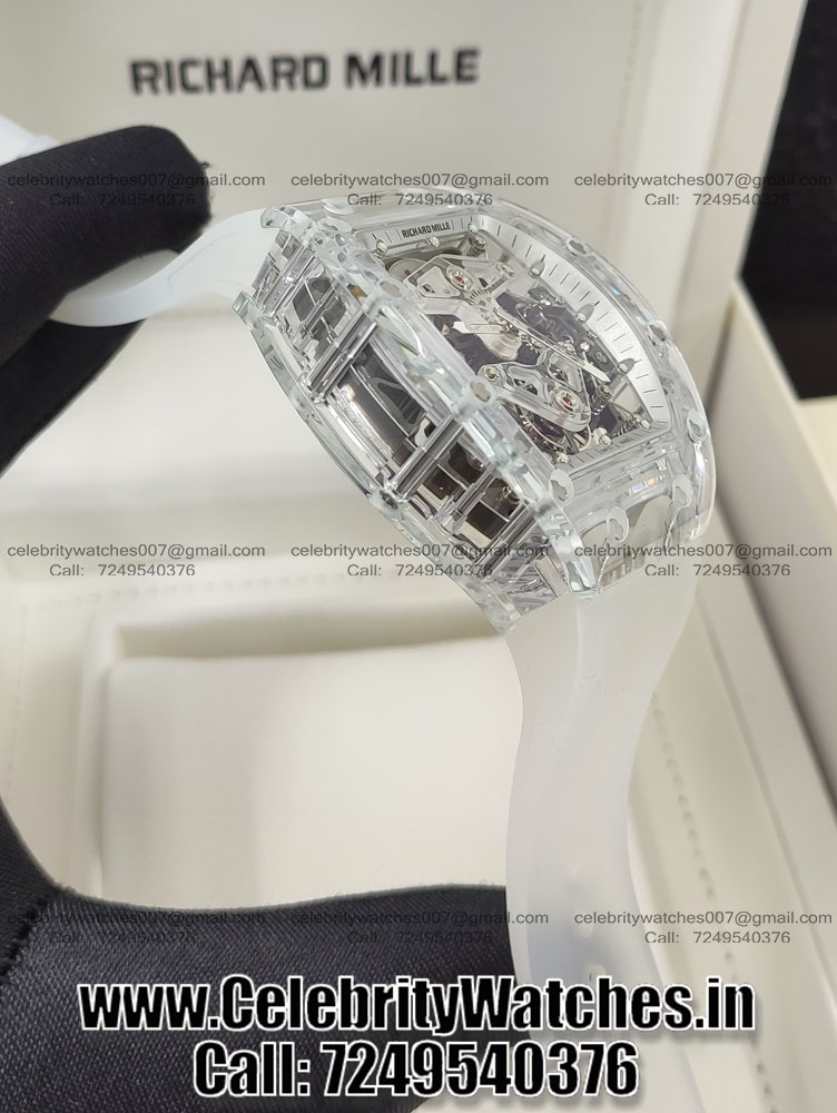| CASE | – Tonneau case shape. Transparent Sapphire Case – Black and grey PVD treatment for the baseplates and bridges made in Grade 5 Titanium. Screw Locked Crown – Transparent Sapphire Crystal Caseback to see inner machine – Dimensions and Weight 100% identical with genuine. |
