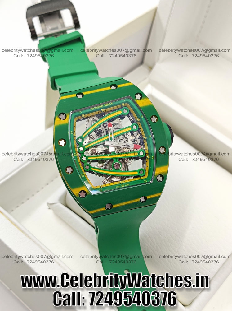 | CASE | – Tonneau case shape. Size: 50mm x 43mm. Thickness: 16mm. Green Carbon Case – Transparent Sapphire Crystal Caseback to see inner machine – Dimensions and Weight 100% identical with genuine. |
