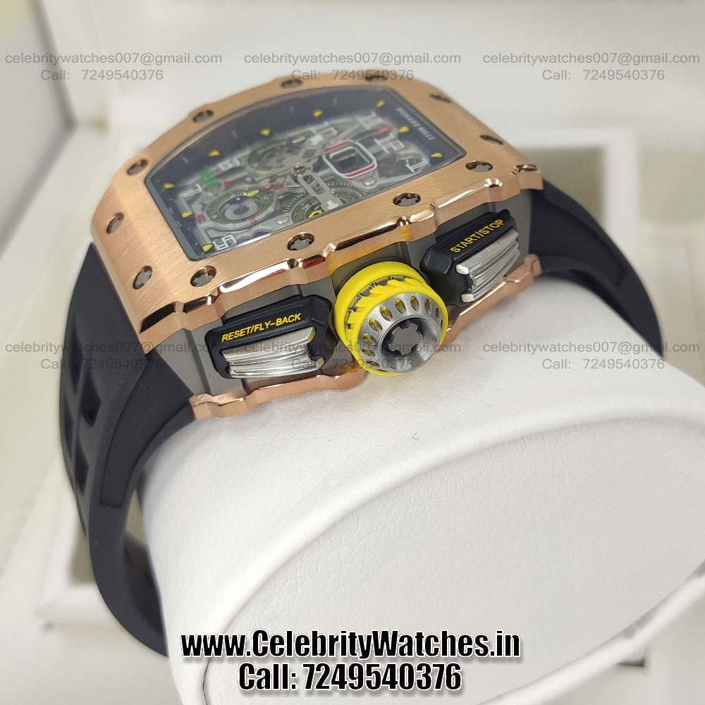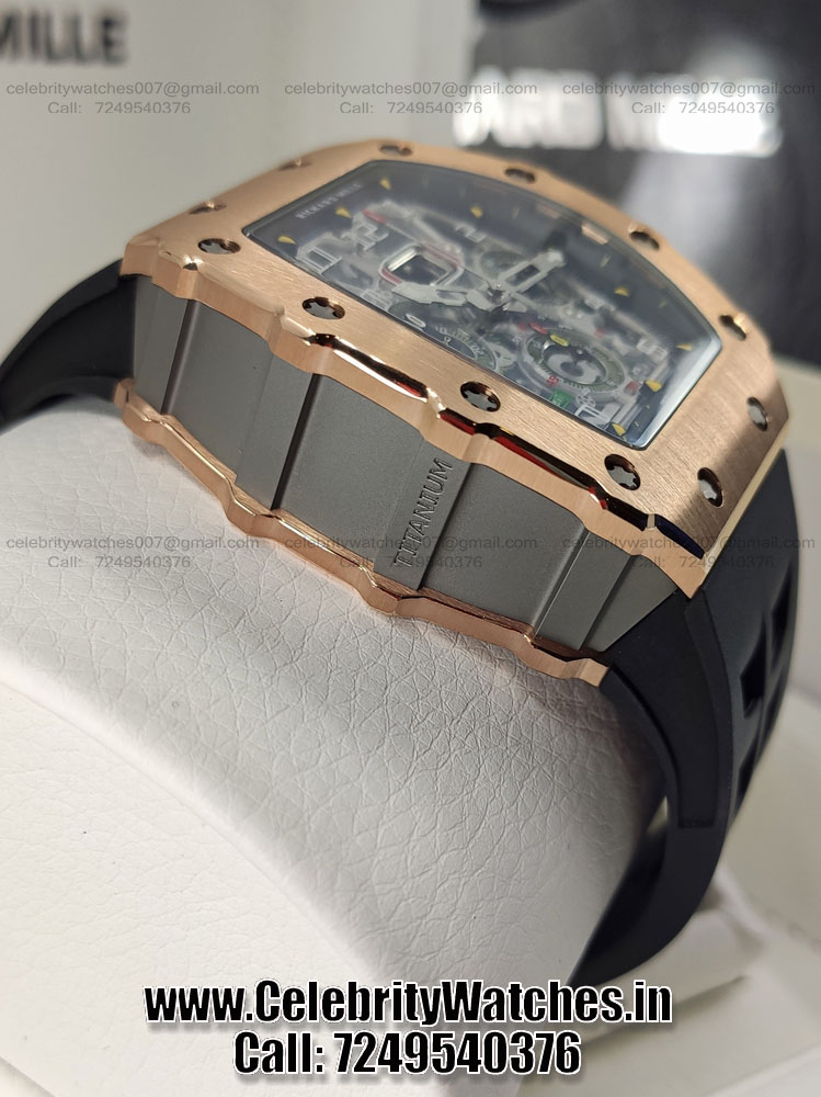 | CASE | – Tonneau case shape. Size: 44.5mm x 49.94mm. Thickness: 16.15 mm. Rose Gold Titanium Case – Black and grey PVD treatment for the baseplates and bridges made in Grade 5 Titanium. Screw Locked Crown – Transparent Sapphire Crystal Caseback to see inner machine – Dimensions and Weight 100% identical with genuine. |