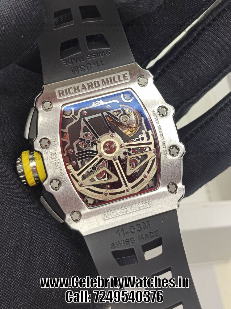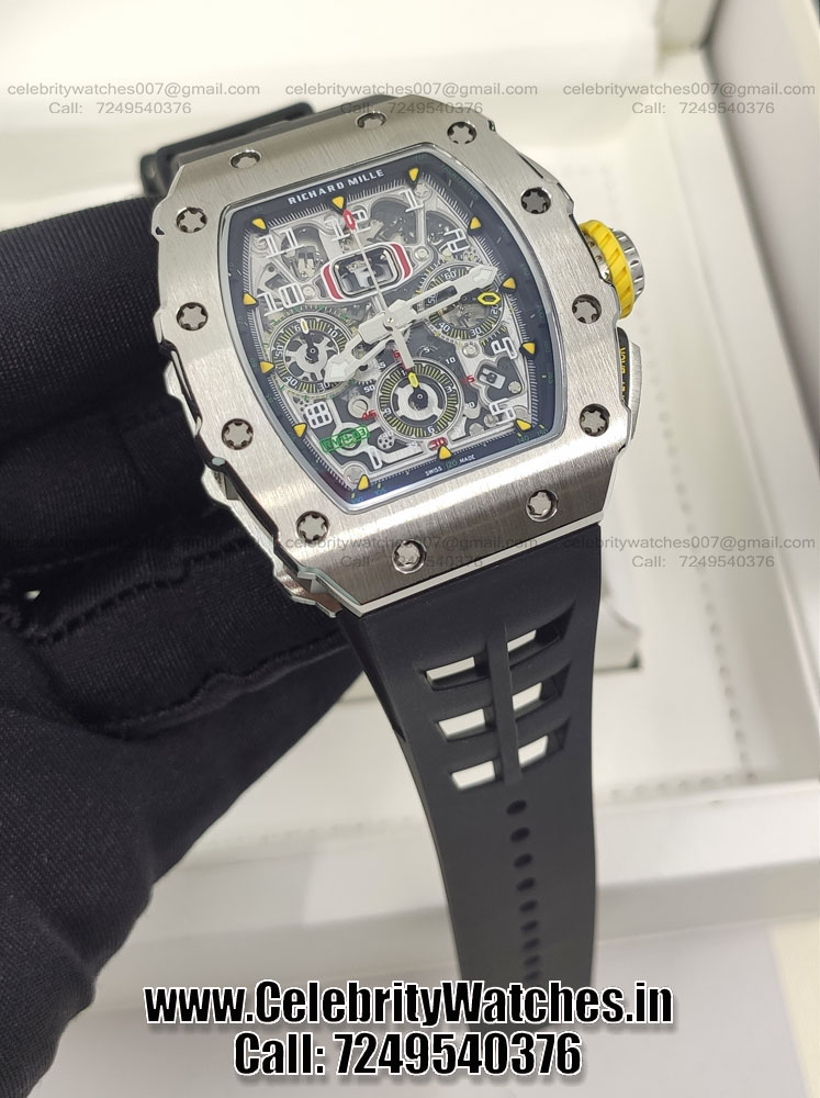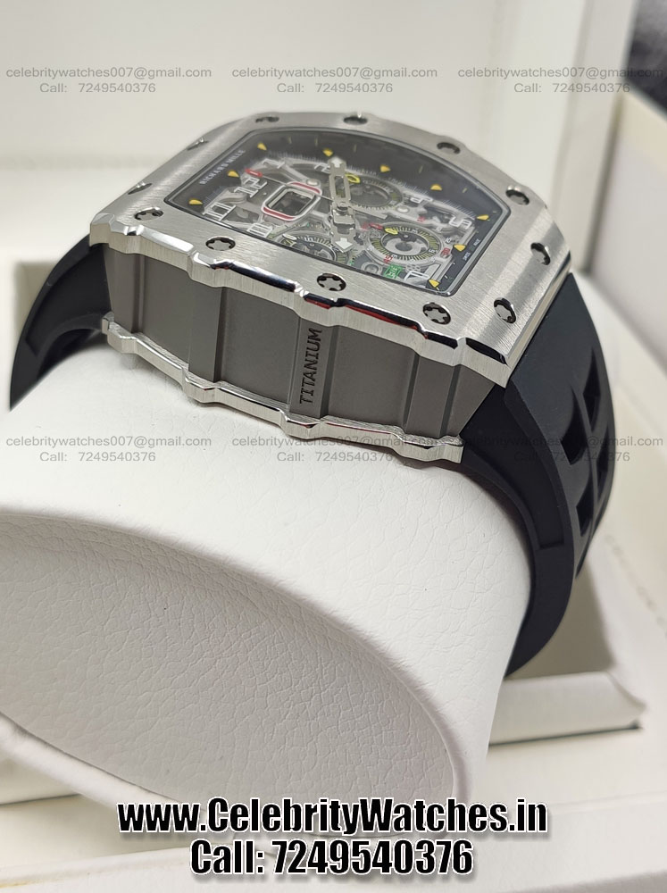 | CASE | – Tonneau case shape. Size: 44.5mm x 49.94mm. Thickness: 16.15 mm. Steel Titanium Case – Black and grey PVD treatment for the baseplates and bridges made in Grade 5 Titanium. Screw Locked Crown – Transparent Sapphire Crystal Caseback to see inner machine – Dimensions and Weight 100% identical with genuine. |